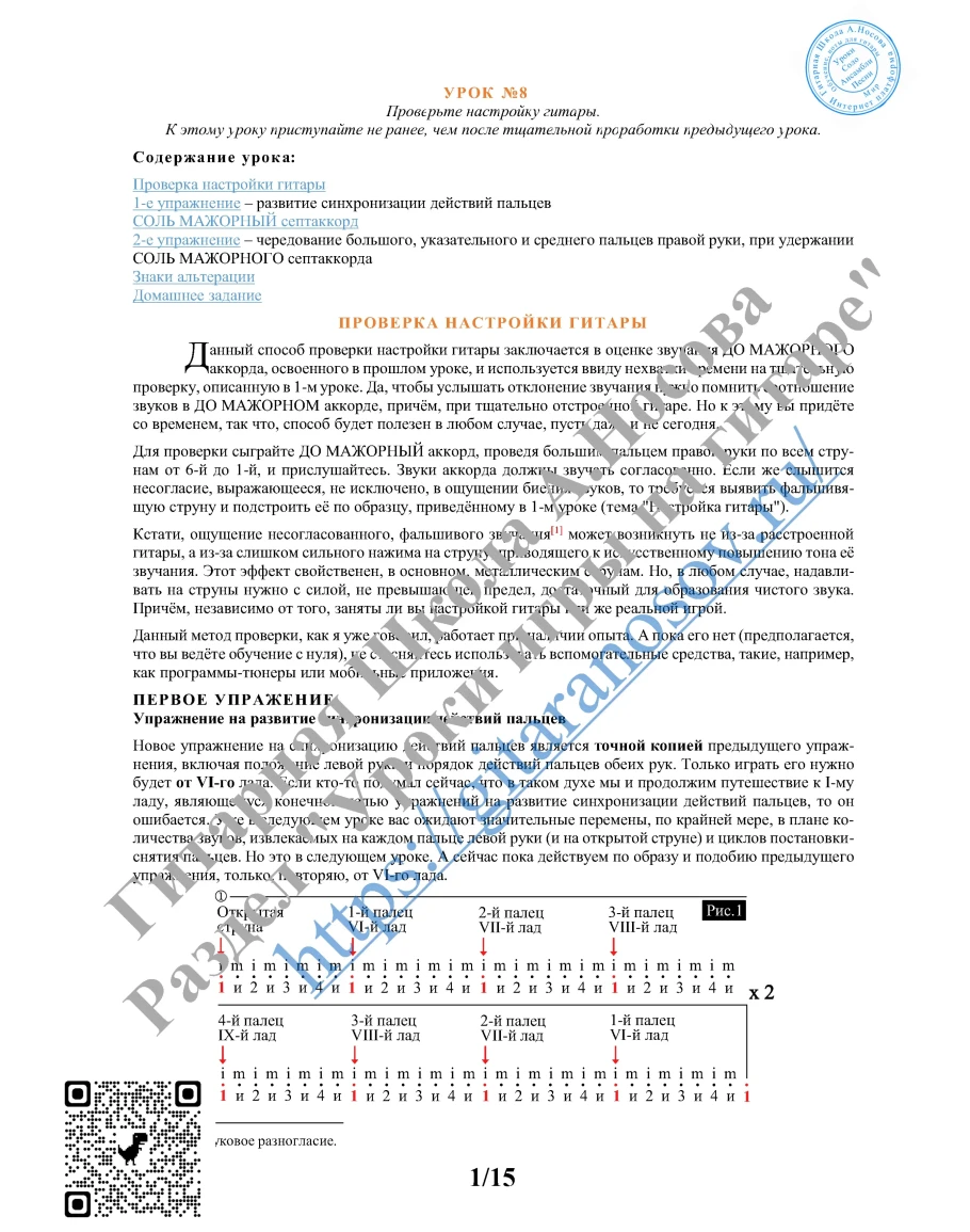 #Проверка настройки гитары. #1-е упражнение – синхронизация движений пальцев (от VI-го лада, по восемь нот). #Соль мажорный септаккорд (соль7). #2-е упражнение – чередование p-i-m пальцев правой руки, при удержании соль мажорного септаккорда. #Знаки альтерации.
