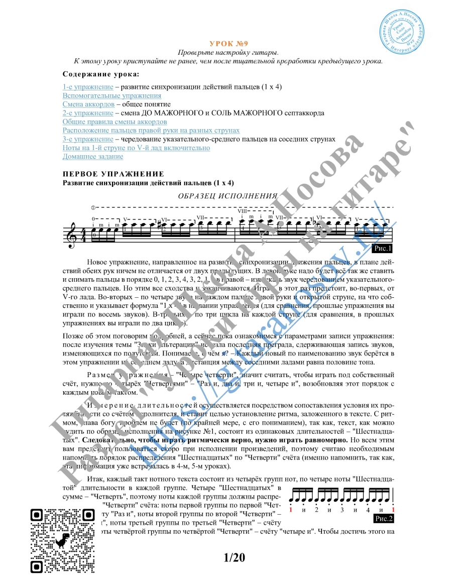 #1-е упражнение – синхронизация движений пальцев (от V-го лада, по четыре ноты). #Техника смена до мажорного и соль мажорного септаккорда. #2-е упражнение – смена до мажорного и соль мажорного септаккорда. #Общие правила смены аккордов. #Расположение пальцев правой руки при игре на соседних струнах. #3-е упражнение – чередование i-m пальцев правой руки на соседних струнах. #Ноты на 1-й струне по V-й лад включительно.