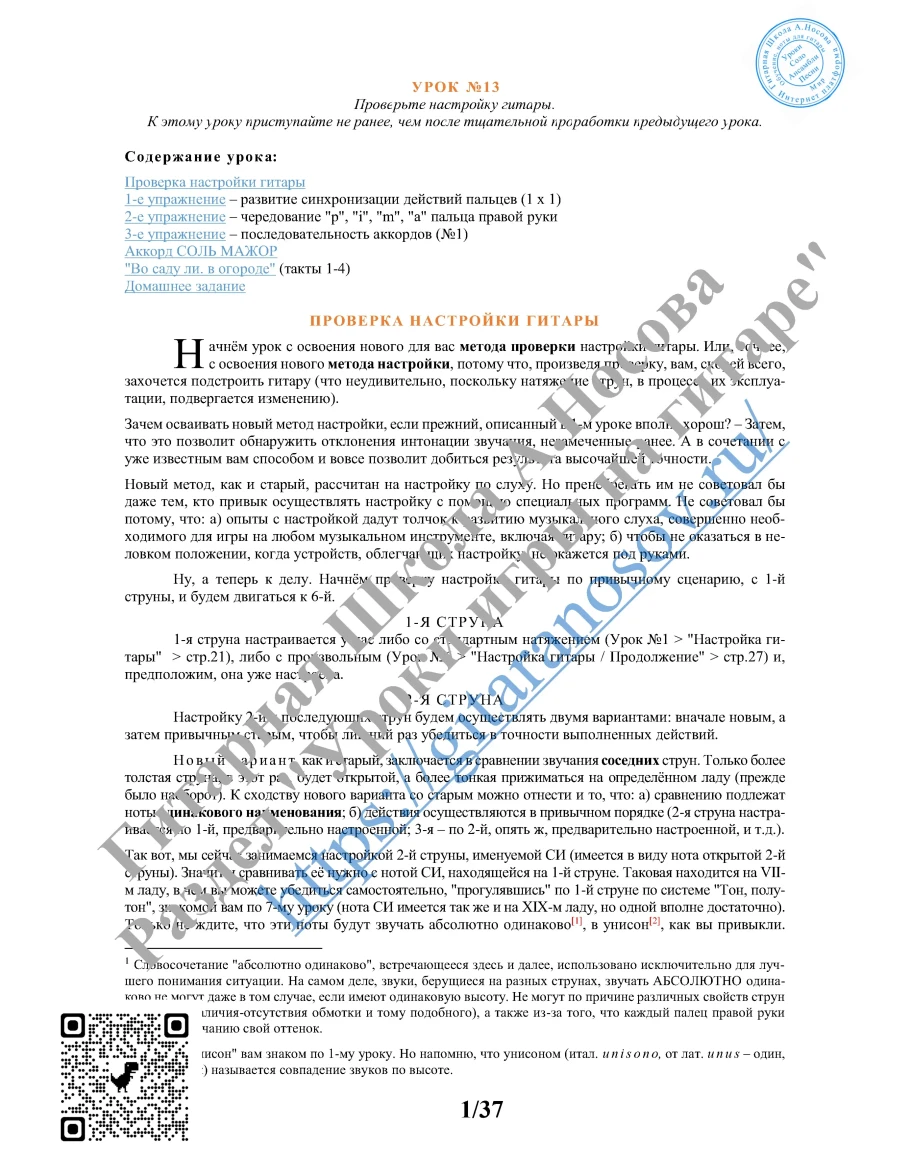 #Проверка настройки гитары. #1-е упражнение – синхронизация движений пальцев (от I-го лада, по одной ноте "половинной" длительности). #2-е упражнение – чередование p-i-m-a пальцев правой руки. #3-е упражнение – последовательность аккордов (№1). #Соль мажорный аккорд. #Композиция – "Во саду ли, в огороде" (Русская народная песня), такты 1-4.