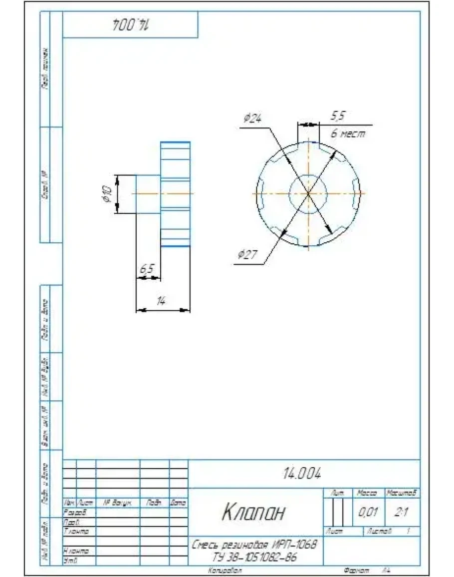 Рабочий чертеж и 3D модель детали клапан 14.004 из сборки 14.000 пневмораспределитель альбома по деталированию Аксарина. Чертеж и модель выполнены в программе Компас 3D