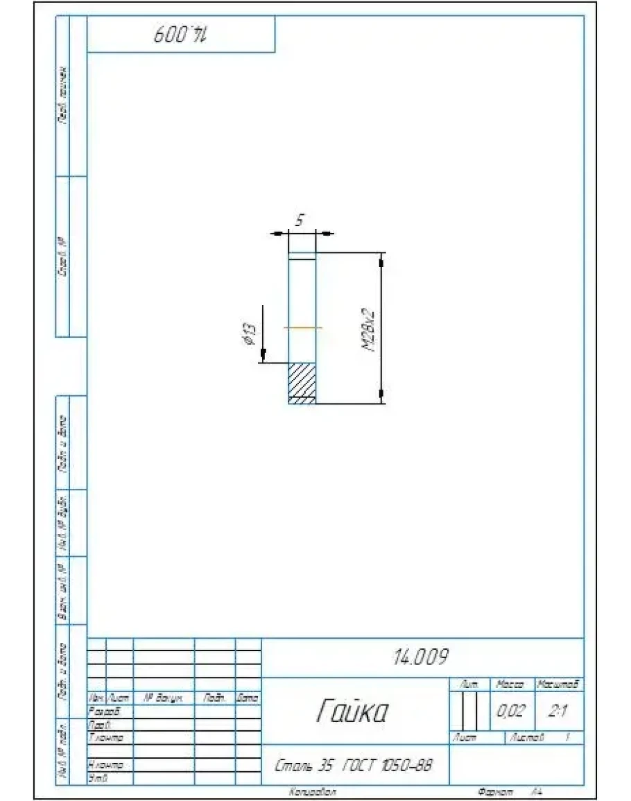Рабочий чертеж и 3D модель детали гайка 14.009 из сборки 14.000 пневмораспределитель альбома по деталированию Аксарина. Чертеж и модель выполнены в программе Компас 3D