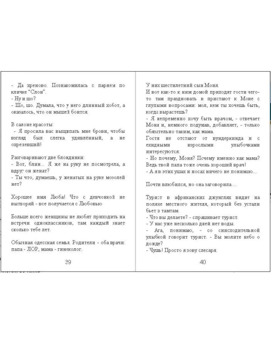 Сознательно не делал тематические выборки, так как считаю, что анекдоты должны идти одним потоком, а не ожидаемо, к примеру, только про тёщу на протяжении десяти страниц.