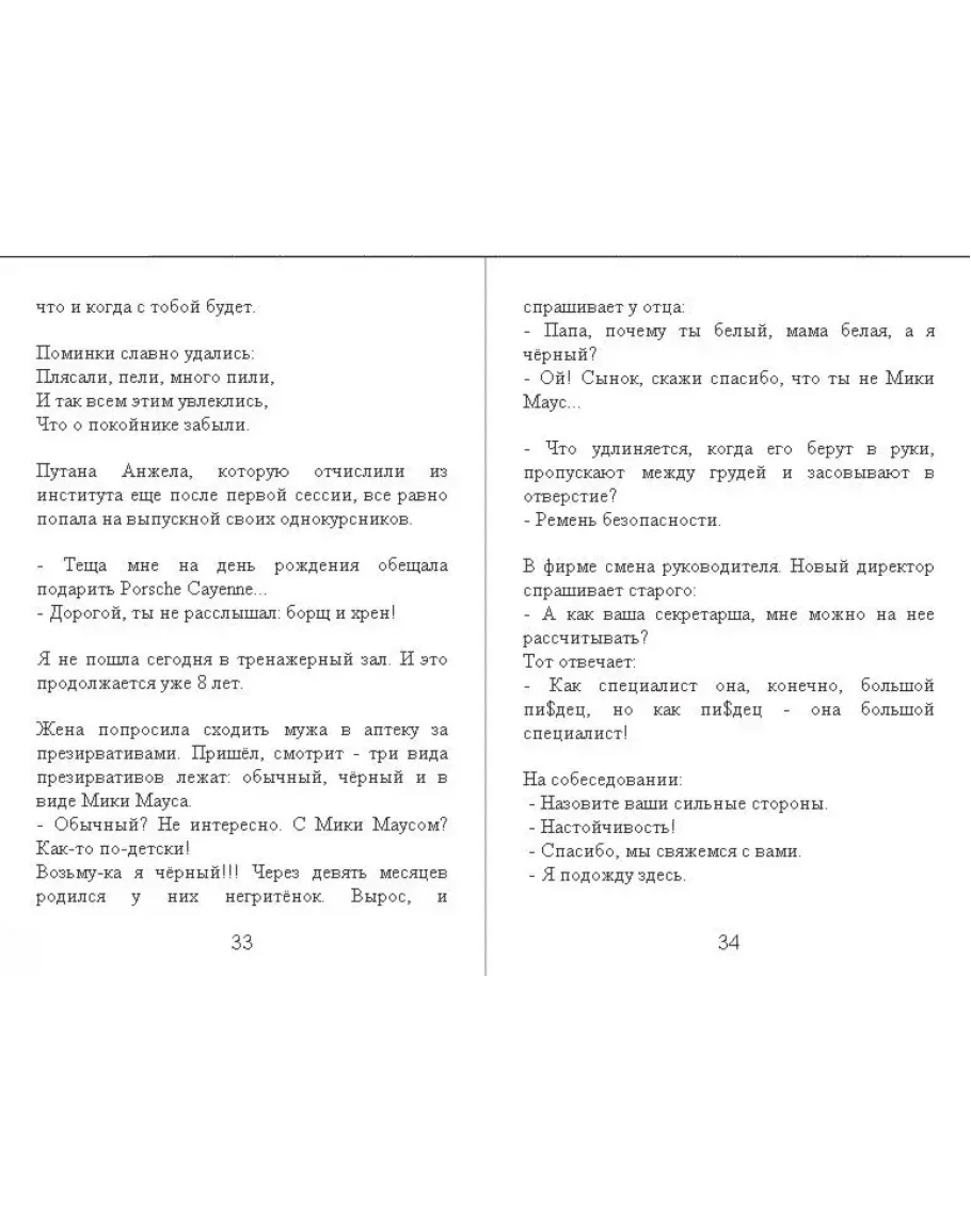 Сознательно не делал тематические выборки, так как считаю, что анекдоты должны идти одним потоком, а не ожидаемо, к примеру, только про тёщу на протяжении десяти страниц.