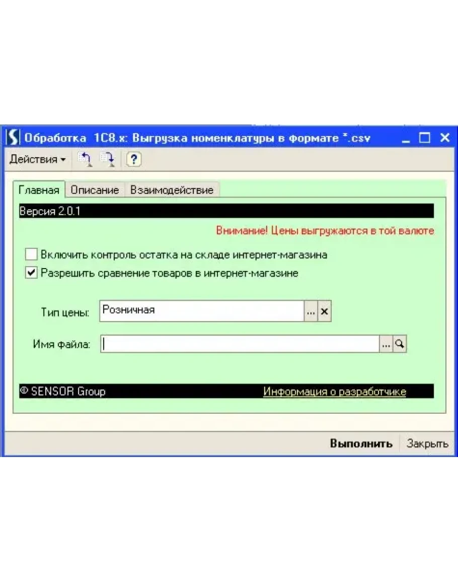 Обработка позволяет выгружать из 1С 8.1 Предприятие товары в формате *.csv для последующего импорта в интернет-магазин. Внешняя обработка адаптирована и проверена в следующем взаимодействии: