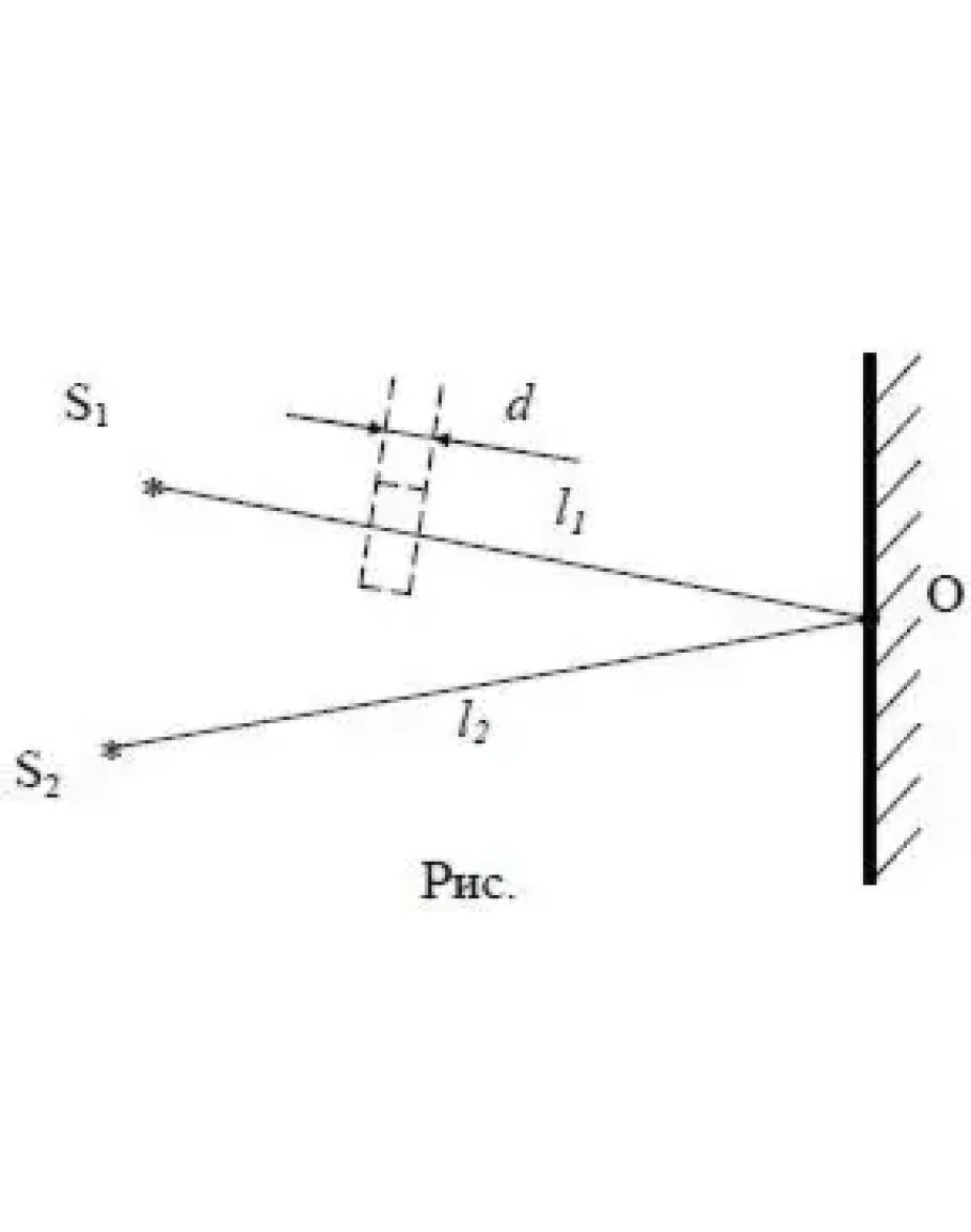 21. От двух когерентных источников S1 и S2 лучи попадают на экран (см. рис.). На экране наблюдается интерференционная картина. Когда на пути одного из лучей перпендикулярно ему поместили мыльную пленку, интерференционная картина изменилась на противоположную. При какой наименьшей толщине dmin пленки это возможно?