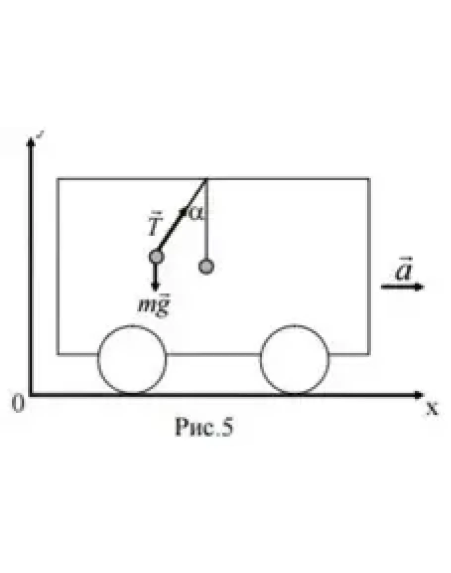 29. В вагоне, движущемся горизонтально с ускорением а = 2 м/с2, висит на шнуре груз массы m = 200 г. Найти силу напряжения шнура и угол отклонения шнура от вертикали (рис.5).
