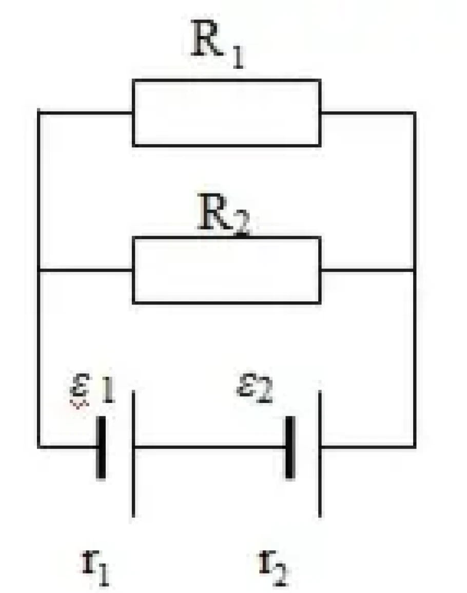 38. Определить внутреннее сопротивление элемента r1, если разность потенциалов на его зажимах равна нулю. R1 = 6 Ом, R2 = 12 Ом, r2 = 0,8 Ом. ЭДС элементов одинаковы.
