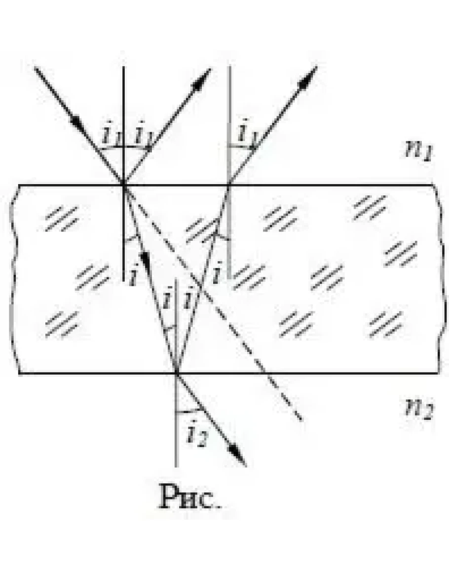 5. Две среды разделены плоскопараллельной пластинкой (см. рис.). Показатели преломления первой среды, второй среды и пластинки соответственно равны n1, n2, n (n > n1). Луч света падает из первой среды на пластинку под углом i1. Определить угол i2, под которым луч выйдет из пластинки.