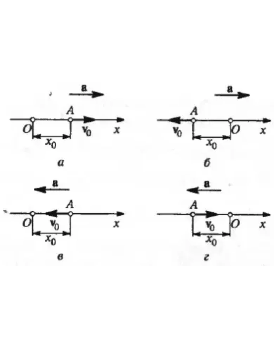 57. Написать кинематическое уравнение движения x=f(t) точки для четырех случаев, представленных на рис. На каждой позиции рисунка – а, б, в, г – изображена координатная ось Ох, указаны начальные положение х0 и скорость υ0 материальной точки A, а также ее ускорение a.