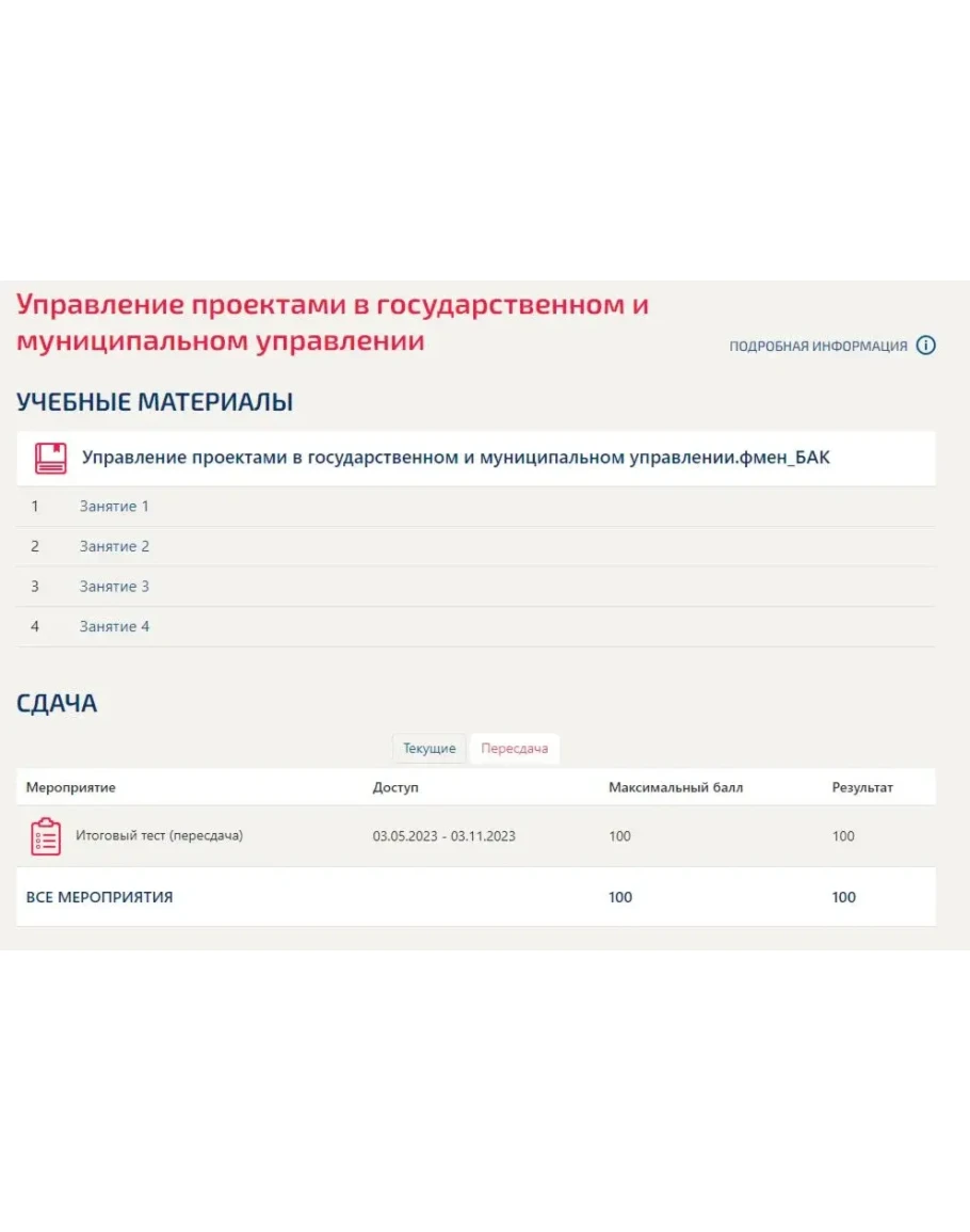 Тест Синергия с ответами "Управление проектами в государственном и муниципальном управлении" тест был сдан на 100 баллов из 100 "Отлично"