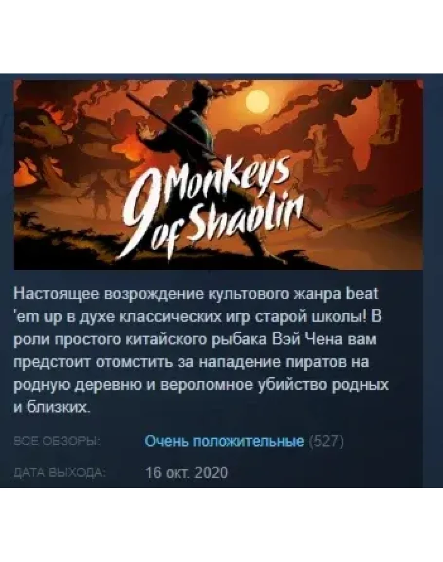 Динамичные схватки, отзывчивое управление и атмосфера олдскульных восточных боевиков — все это делает 9 Monkeys of Shaolin идеальной игрой для истинных поклонников настоящего хардкора и непрекращающихся сражений.