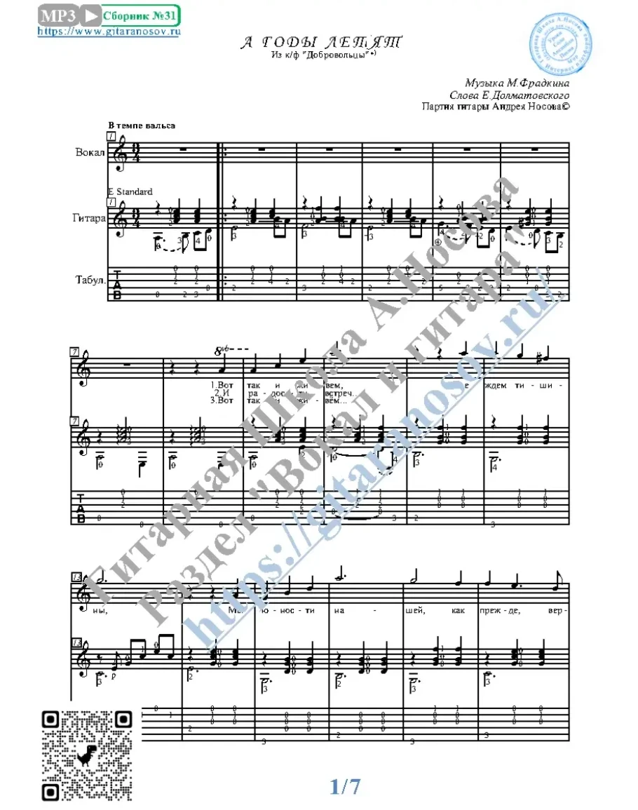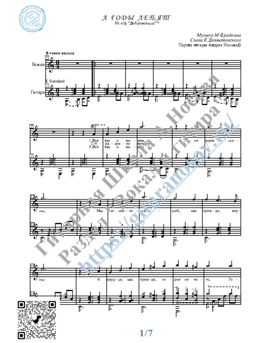 Кликните "Подробнее" для получения дополнительной информацииВашему вниманию предлагается композиция "А годы летят (муз.М.Фрадкина, сл.Е.Долматовского)", предназначенная для вокала в сопровождении 6-ти струнной гитары. Запись выполнена нотами и включает в себя партию вокала с подтекстовкой, партию гитары с подробнейшей аппликатурой и текст песни (НА РУССКОМ).