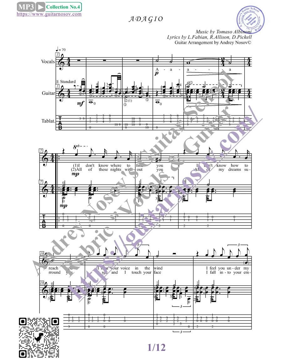 Кликните "Подробнее" для получения дополнительной информацииВашему вниманию предлагается композиция "Adagio (mus.T.Albinoni, lyr.L.Fabian, R.Allison, D.Pickell)", предназначенная для вокала в сопровождении 6-ти струнной гитары. Запись выполнена нотами и включает в себя партию вокала с подтекстовкой, партию гитары с подробнейшей аппликатурой и текст песни (НА АНГЛИЙСКОМ). Партия гитары продублирована табулатурой.