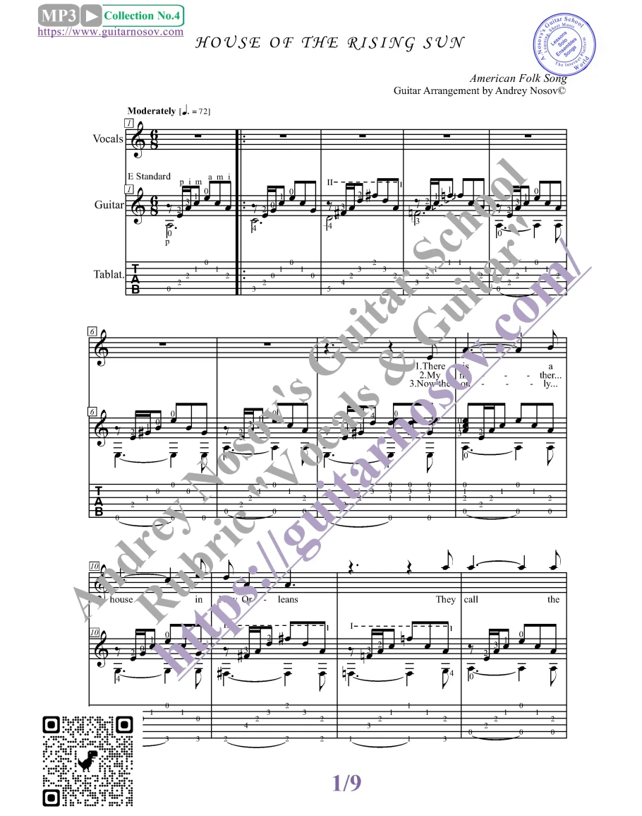 Кликните "Подробнее" для получения дополнительной информацииВашему вниманию предлагается композиция "House of the Rising Sun (American Folk Song)", предназначенная для вокала в сопровождении 6-ти струнной гитары. Запись выполнена нотами и включает в себя партию вокала с подтекстовкой, партию гитары с подробнейшей аппликатурой и текст песни (НА АНГЛИЙСКОМ). Партия гитары продублирована табулатурой.