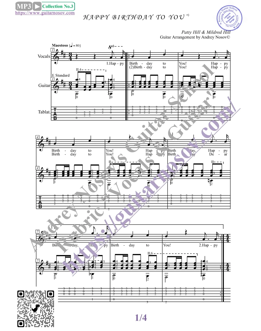 Кликните "Подробнее" для получения дополнительной информацииВашему вниманию предлагается композиция "Happy Birthday to You (P.Hill-M.Hill)", предназначенная для вокала в сопровождении 6-ти струнной гитары. Запись выполнена нотами и включает в себя партию вокала с подтекстовкой, партию гитары с подробнейшей аппликатурой и текст песни (НА АНГЛИЙСКОМ). Партия гитары продублирована табулатурой.