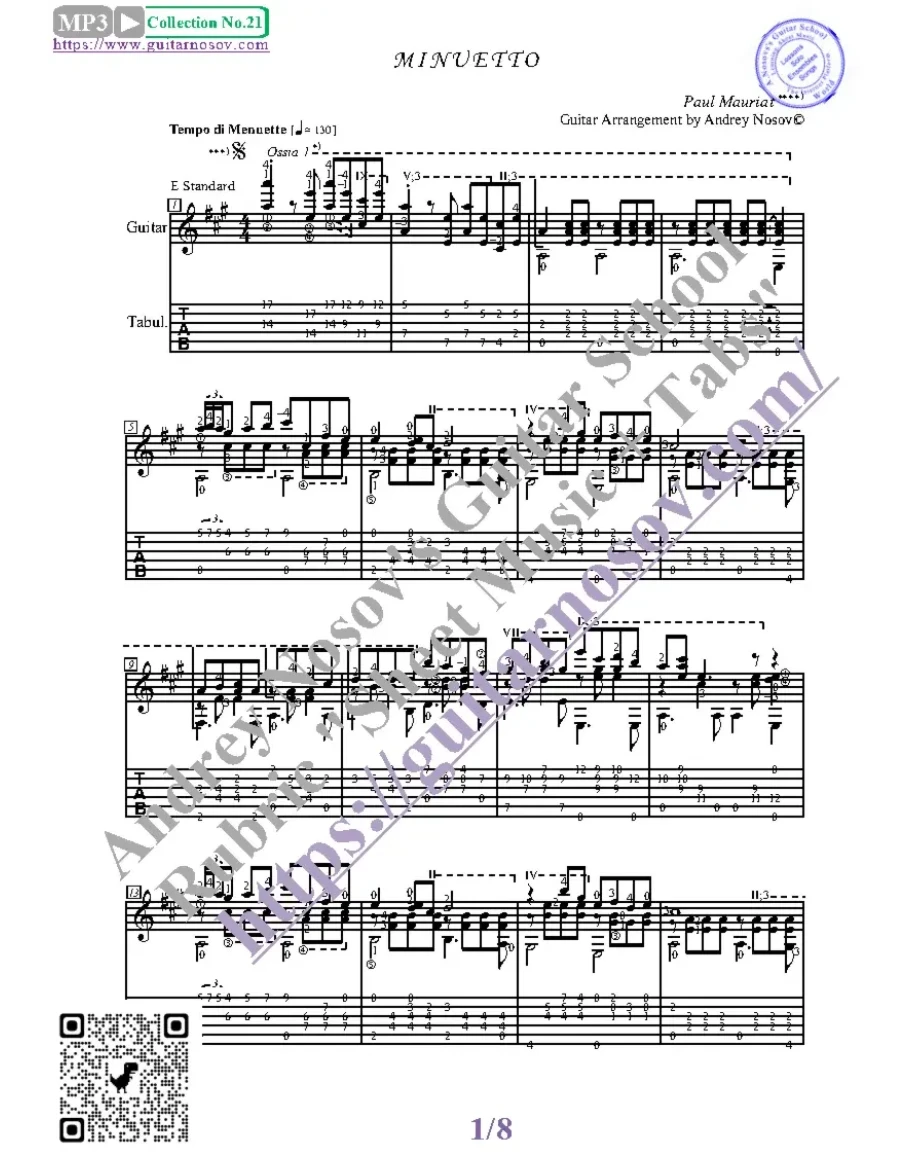 Кликните "Подробнее" для получения дополнительной информацииВашему вниманию предлагается композиция "Minuetto (P.Mauriat)", предназначенная для исполнения на 6-ти струнной гитаре СОЛО. Запись выполнена нотами, сопровождена подробнейшей аппликатурой и продублирована табулатурой.