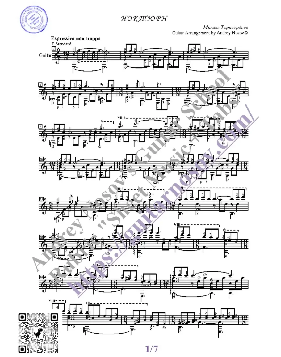 Кликните "Подробнее" для получения дополнительной информацииВашему вниманию предлагается композиция "Ноктюрн (М.Таривердиев)", предназначенная для 6-ти струнной гитары СОЛО. Запись выполнена нотами, сопровождена подробнейшей аппликатурой и продублирована табулатурой.