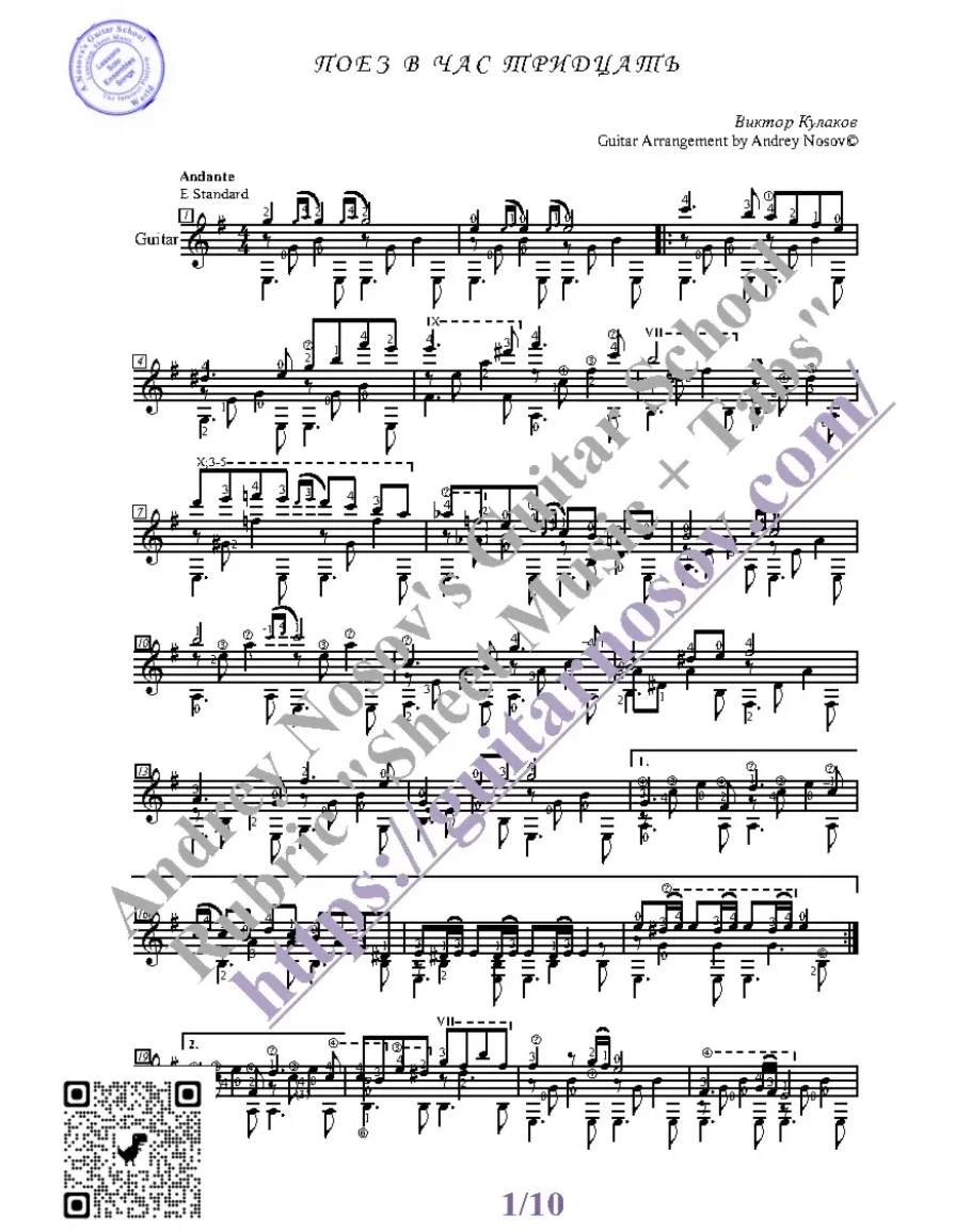 Кликните "Подробнее" для получения дополнительной информацииВашему вниманию предлагается композиция "Поезд в 1.30 (В.Кулаков)", предназначенная для исполнения на 6-ти струнной гитаре СОЛО. Запись выполнена нотами, сопровождена подробнейшей аппликатурой и продублирована табулатурой.