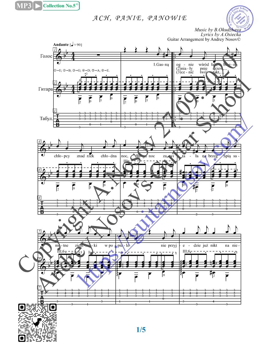Кликните "Подробнее" для получения дополнительной информацииВашему вниманию предлагается композиция "Ах, пани, панове (муз.Б.Окуджавы, сл.А.Осецкой, русс.текст Б.Окуджавы)", предназначенная для вокала в сопровождении 6-ти струнной гитары (pdf / png*). Запись выполнена нотами и включает в себя партию вокала с подтекстовкой, партию гитары с подробнейшей аппликатурой, текст песни (НА РУССКОМ ЯЗЫКЕ). Партия гитары продублирована табулатурой. Прилагается ссылка на скачивание mp3.