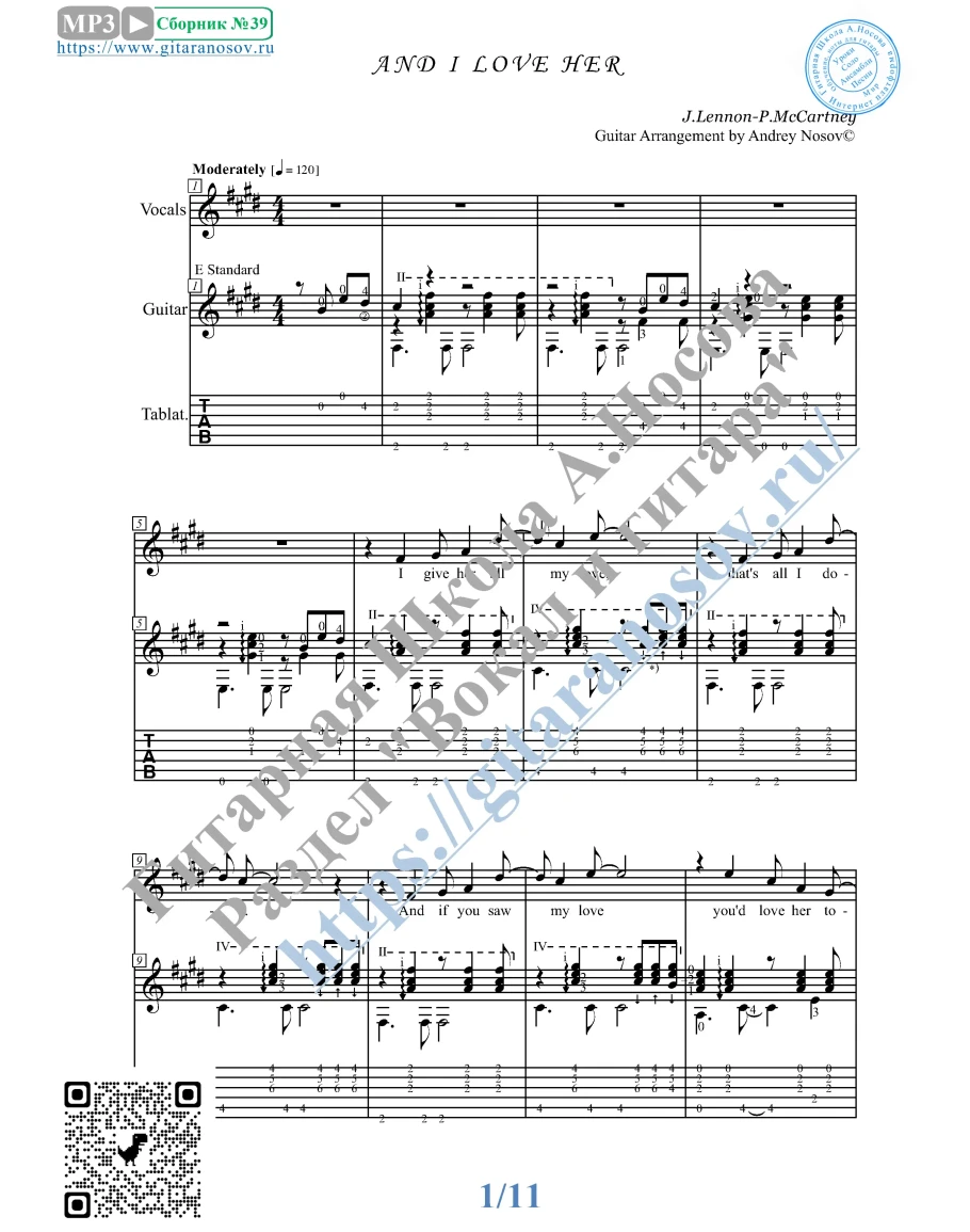 Кликните "Подробнее" для получения дополнительной информацииВашему вниманию предлагается композиция "And I Love Her (J.Lennon-P.McCartney)", предназначенная для вокала в сопровождении 6-ти струнной гитары. Запись выполнена нотами и включает в себя партию вокала с подтекстовкой, партию гитары с подробнейшей аппликатурой и текст песни (НА АНГЛИЙСКОМ). Партия гитары продублирована табулатурой.