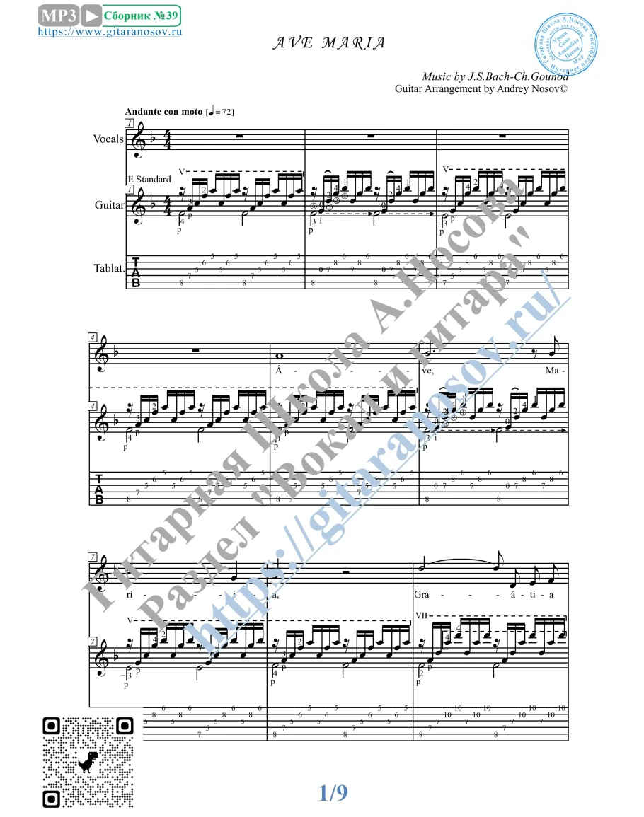 Кликните "Подробнее" для получения дополнительной информацииВашему вниманию предлагается композиция "Ave Maria (J.S.Bach-Ch.Gounod)", предназначенная для вокала в сопровождении 6-ти струнной гитары. Запись выполнена нотами и включает в себя партию вокала с подтекстовкой, партию гитары с подробнейшей аппликатурой и текст песни (НА ИСПАНСКОМ). Партия гитары продублирована табулатурой.
