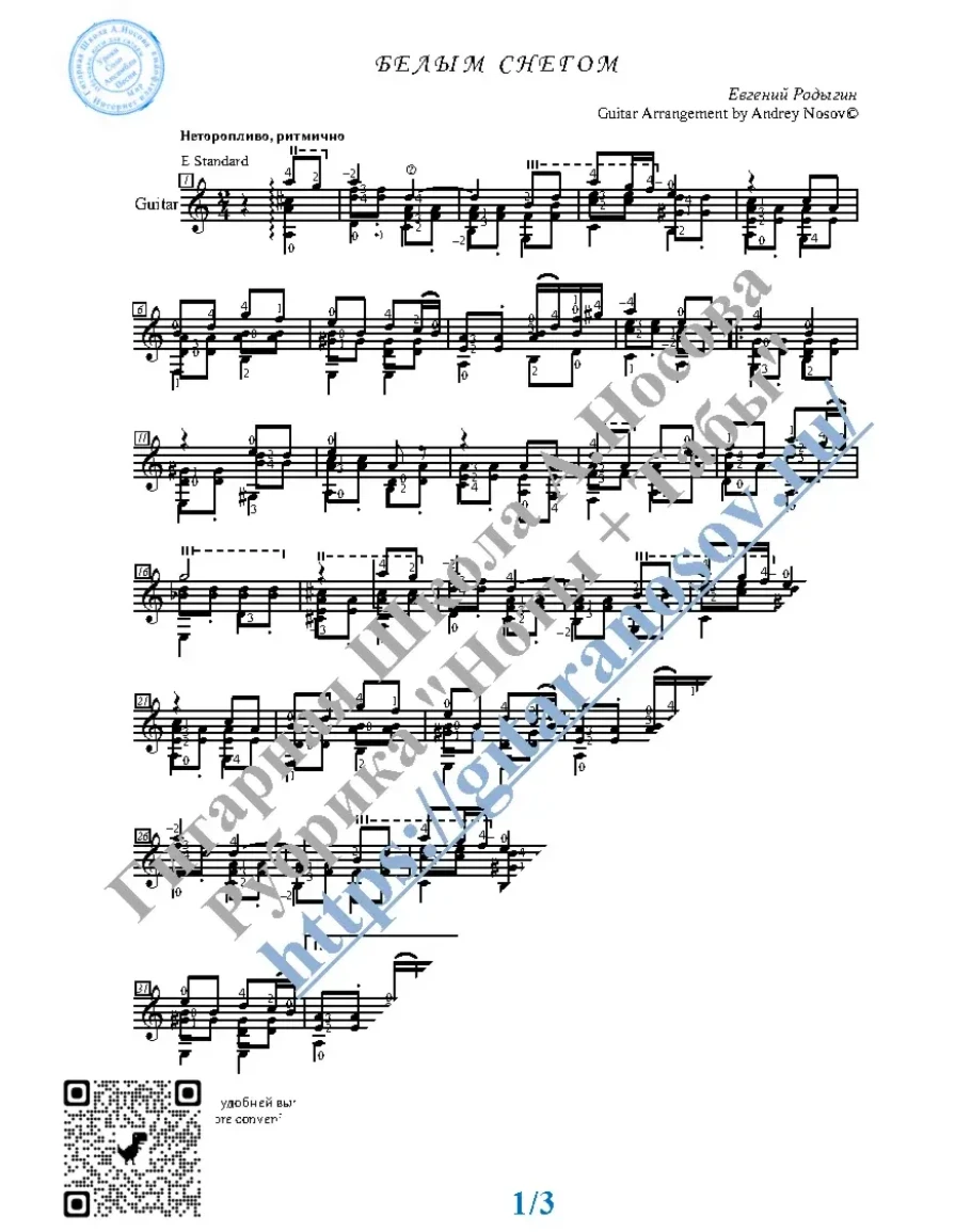Кликните "Подробнее" для получения дополнительной информацииВашему вниманию предлагается песня "Белым снегом" (Е.Родыгин), предназначенная для исполнения на 6-ти струнной гитаре соло. Запись выполнена нотами, сопровождена подробнейшей аппликатурой и продублирована табулатурой. И ещё…