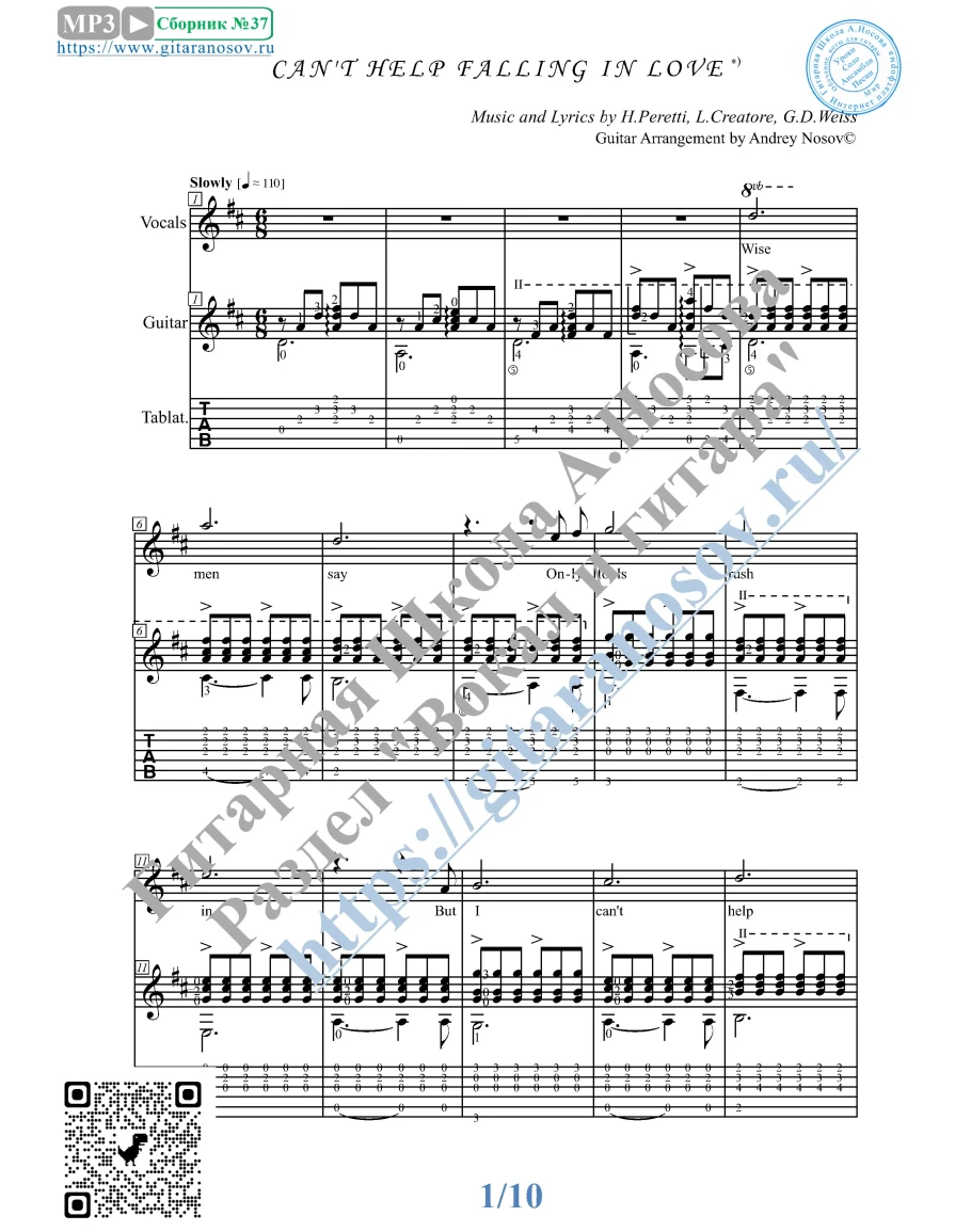 Кликните "Подробнее" для получения дополнительной информацииВашему вниманию предлагается композиция "Can't Help Falling in Love (H.Peretti, L.Creatore, G.D.Weiss)", предназначенная для вокала в сопровождении 6-ти струнной гитары. Запись выполнена нотами и включает в себя партию вокала с подтекстовкой, партию гитары с подробнейшей аппликатурой и текст песни (НА АНГЛИЙСКОМ). Партия гитары продублирована табулатурой.