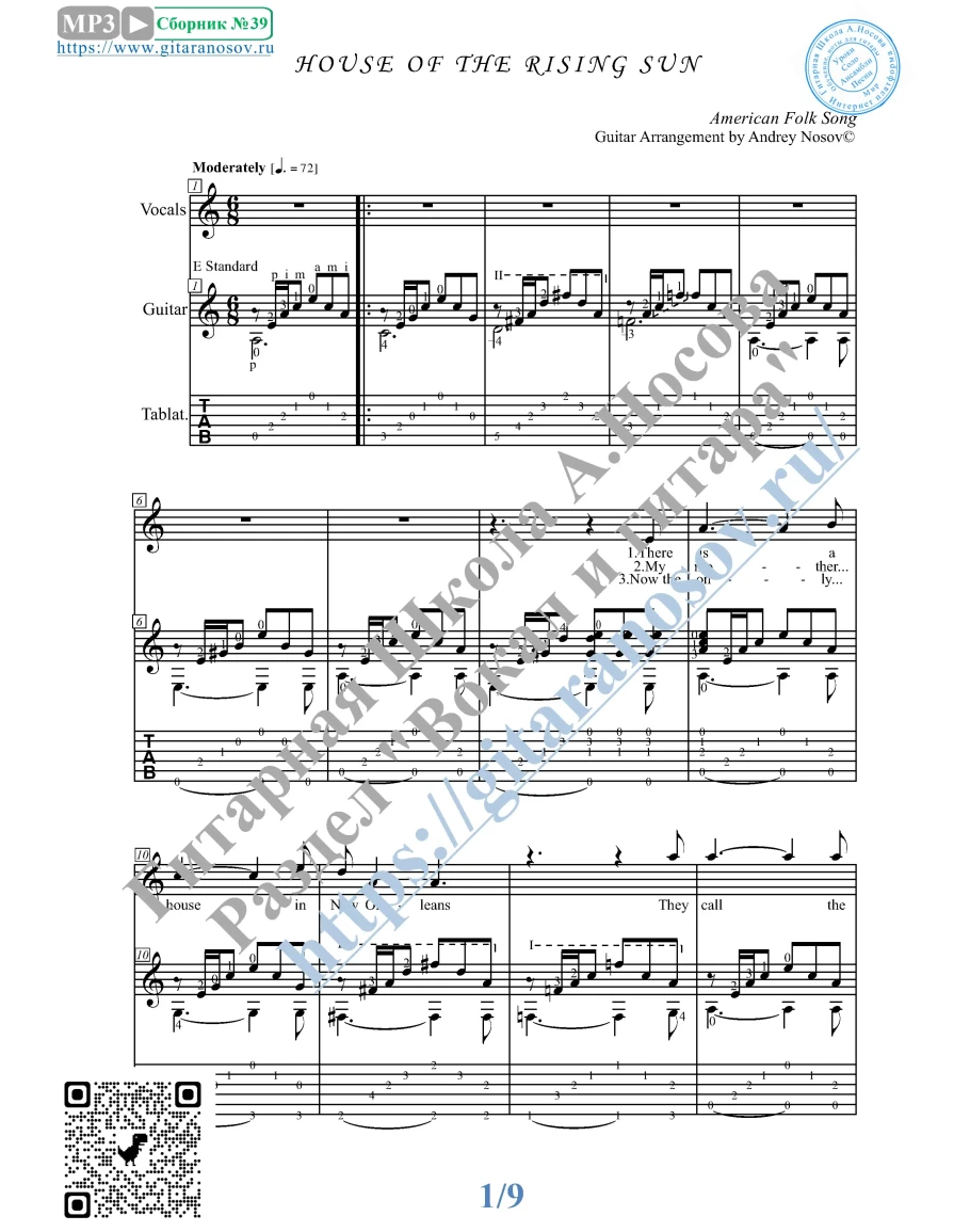 Кликните "Подробнее" для получения дополнительной информацииВашему вниманию предлагается композиция "House of the Rising Sun (American Folk Song)", предназначенная для вокала в сопровождении 6-ти струнной гитары. Запись выполнена нотами и включает в себя партию вокала с подтекстовкой, партию гитары с подробнейшей аппликатурой и текст песни (НА АНГЛИЙСКОМ). Партия гитары продублирована табулатурой.