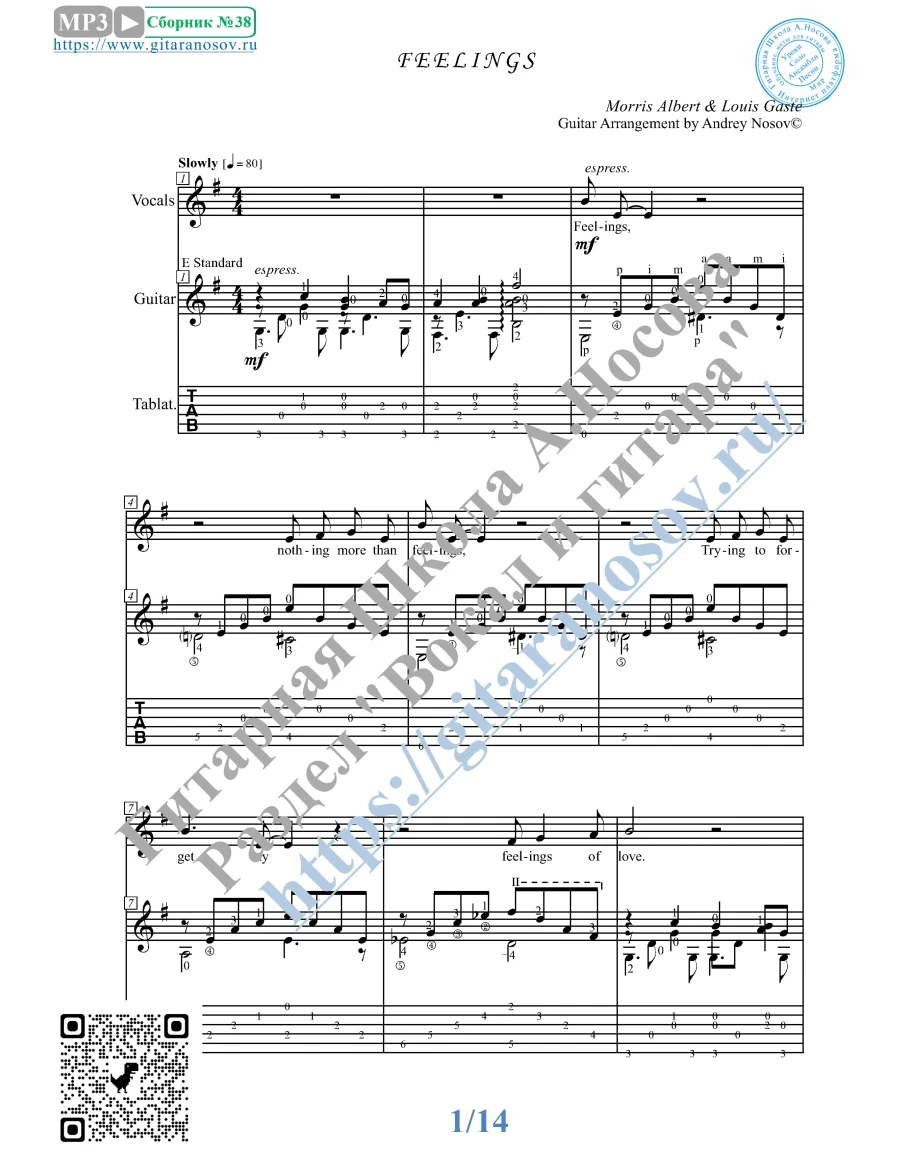 Кликните "Подробнее" для получения дополнительной информацииВашему вниманию предлагается композиция "Feelings (M.Albert-L.Gaste)", предназначенная для вокала в сопровождении 6-ти струнной гитары. Запись выполнена нотами и включает в себя партию вокала с подтекстовкой, партию гитары с подробнейшей аппликатурой и текст песни (НА АНГЛИЙСКОМ). Партия гитары продублирована табулатурой.