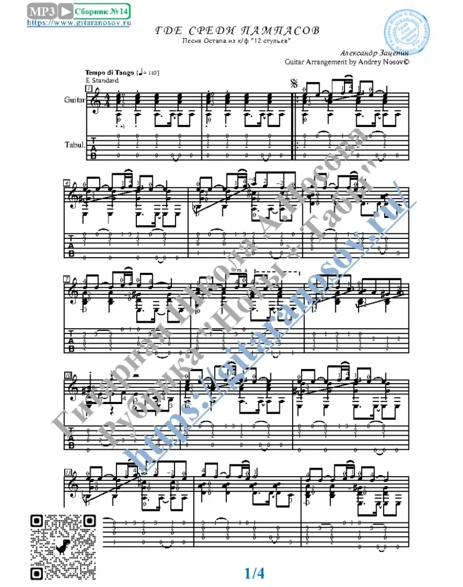 Кликните "Подробнее" для получения дополнительной информацииВашему вниманию предлагается песня "Где среди пампасов" (А.Зацепин), из к/ф "Двенадцать стульев", предназначенная для исполнения на 6-ти струнной гитаре СОЛО. Запись выполнена нотами, сопровождена подробнейшей аппликатурой и продублирована табулатурой. И ещё…