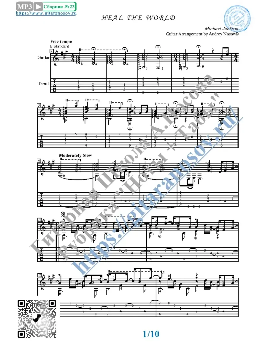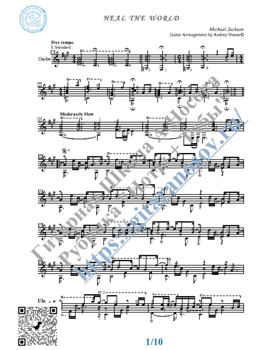 Кликните "Подробнее" для получения дополнительной информацииВашему вниманию предлагается композиция "Heal The World (M.Jackson)", предназначенная для исполнения на 6-ти струнной гитаре СОЛО. Запись выполнена нотами, сопровождена подробнейшей аппликатурой и продублирована табулатурой.
