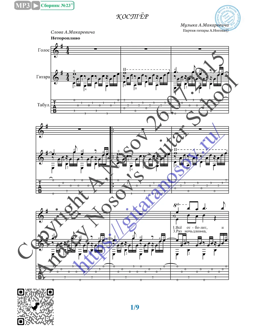 Кликните "Подробнее" для получения дополнительной информацииВашему вниманию предлагается композиция "Костёр (А.Макаревич)", предназначенная для вокала в сопровождении 6-ти струнной гитары (pdf / png*). Запись выполнена нотами и включает в себя партию вокала с подтекстовкой, партию гитары с подробнейшей аппликатурой, текст песни (НА РУССКОМ ЯЗЫКЕ). Партия гитары продублирована табулатурой. Прилагается ссылка на скачивание mp3.