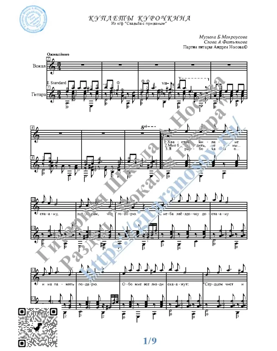 Кликните "Подробнее" для получения дополнительной информацииВашему вниманию предлагается композиция "Куплеты Курочкина (муз.Б.Мокроусова, сл.А.Фатьянова)", предназначенная для вокала в сопровождении 6-ти струнной гитары. Запись выполнена нотами и включает в себя партию вокала с подтекстовкой, партию гитары с подробнейшей аппликатурой и текст песни (НА РУССКОМ).