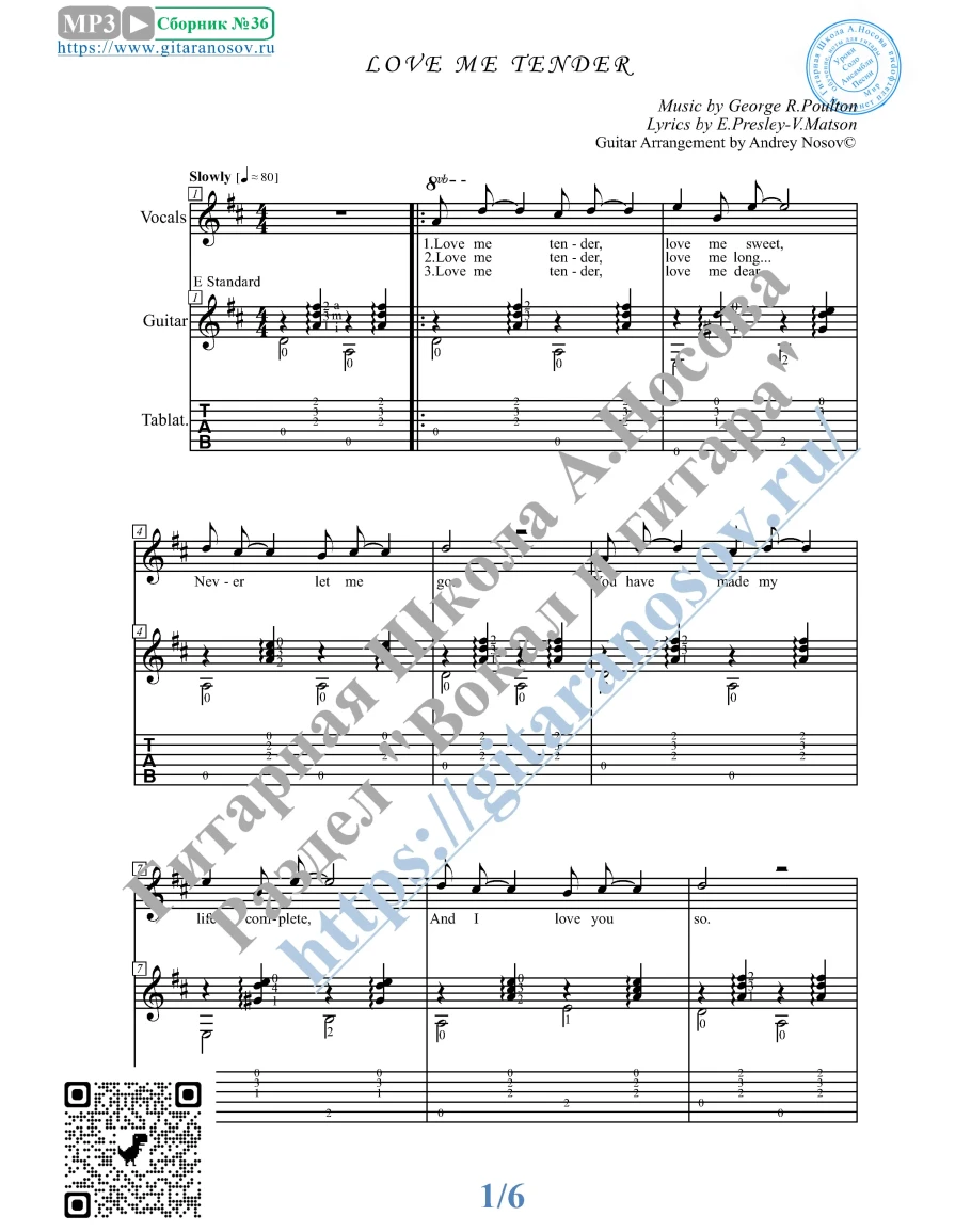 Кликните "Подробнее" для получения дополнительной информацииВашему вниманию предлагается композиция "Love Me Tender (mus.G.R.Poulton, lir.E.Presley-V.Matson)", предназначенная для вокала в сопровождении 6-ти струнной гитары. Запись выполнена нотами и включает в себя партию вокала с подтекстовкой, партию гитары с подробнейшей аппликатурой и текст песни (НА АНГЛИЙСКОМ). Партия гитары продублирована табулатурой.