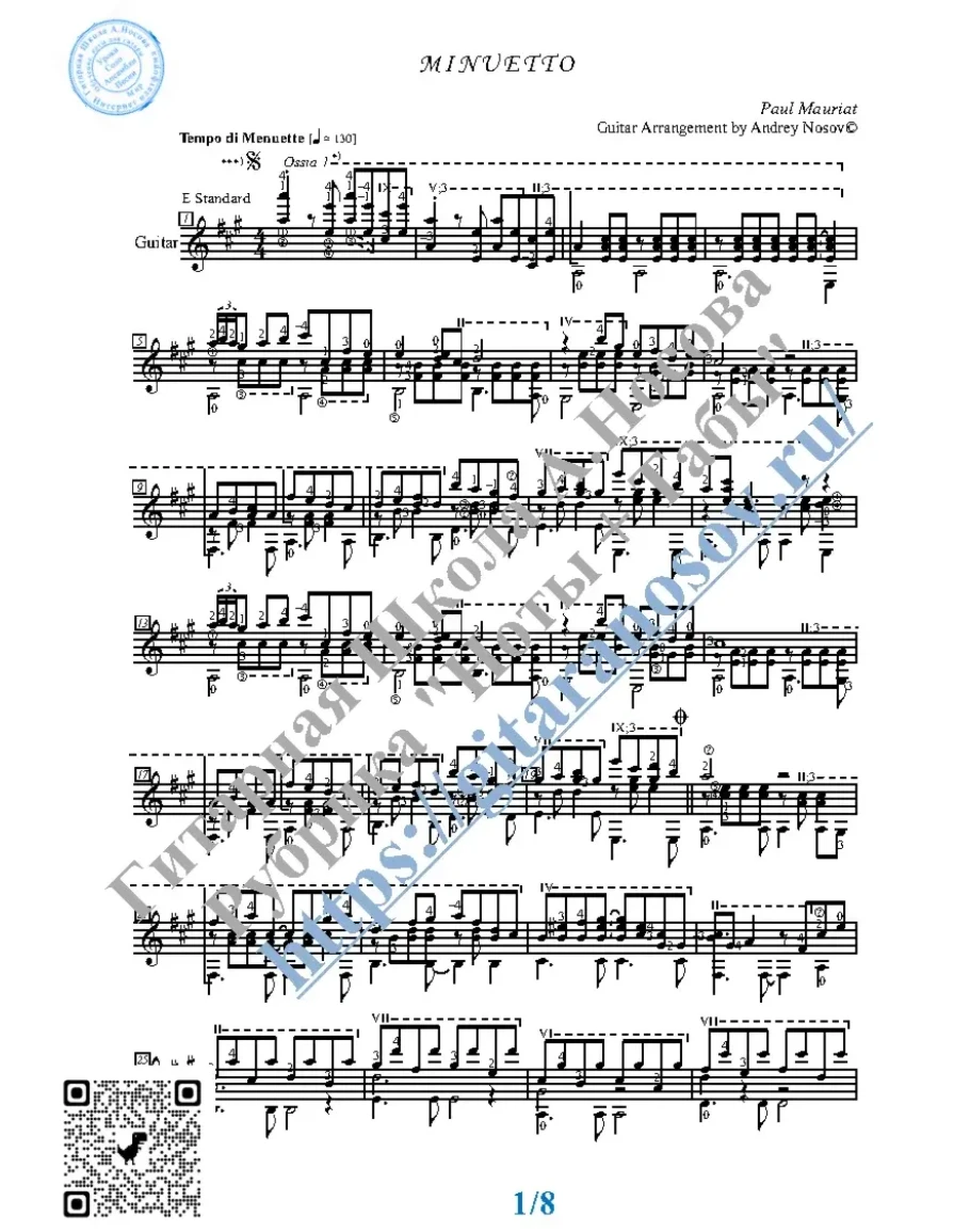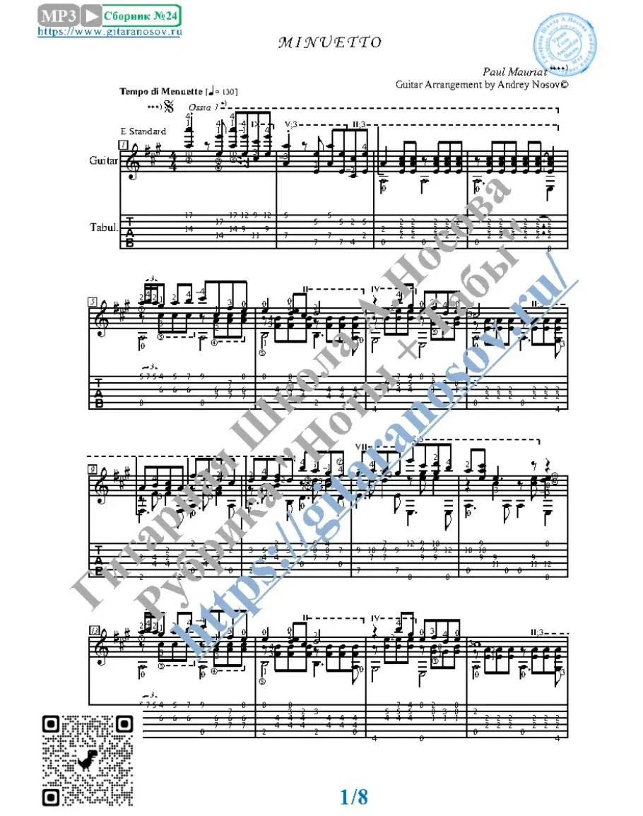 Кликните "Подробнее" для получения дополнительной информацииВашему вниманию предлагается композиция "Minuetto (P.Mauriat)", предназначенная для исполнения на 6-ти струнной гитаре СОЛО. Запись выполнена нотами, сопровождена подробнейшей аппликатурой и продублирована табулатурой. И ещё…