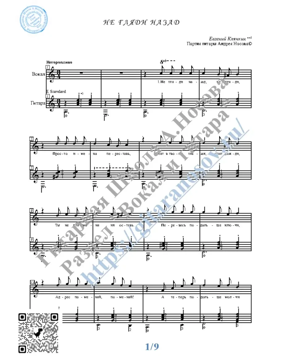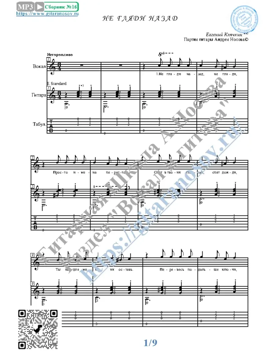 Кликните "Подробнее" для получения дополнительной информацииВашему вниманию предлагается композиция "Не гляди назад (Е.Клячкин)", предназначенная для вокала в сопровождении 6-ти струнной гитары. Запись выполнена нотами и включает в себя партию вокала с подтекстовкой, партию гитары с подробнейшей аппликатурой и текст песни (НА РУССКОМ).
