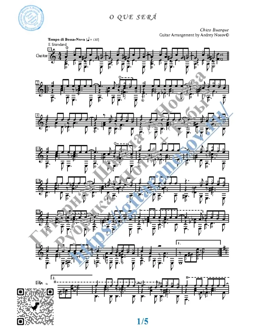 Кликните "Подробнее" для получения дополнительной информацииВашему вниманию предлагается песня "O Que Sera (Ch.Buarque)", предназначенная для исполнения на 6-ти струнной гитаре СОЛО. Запись выполнена нотами, сопровождена подробнейшей аппликатурой и продублирована табулатурой. И ещё…