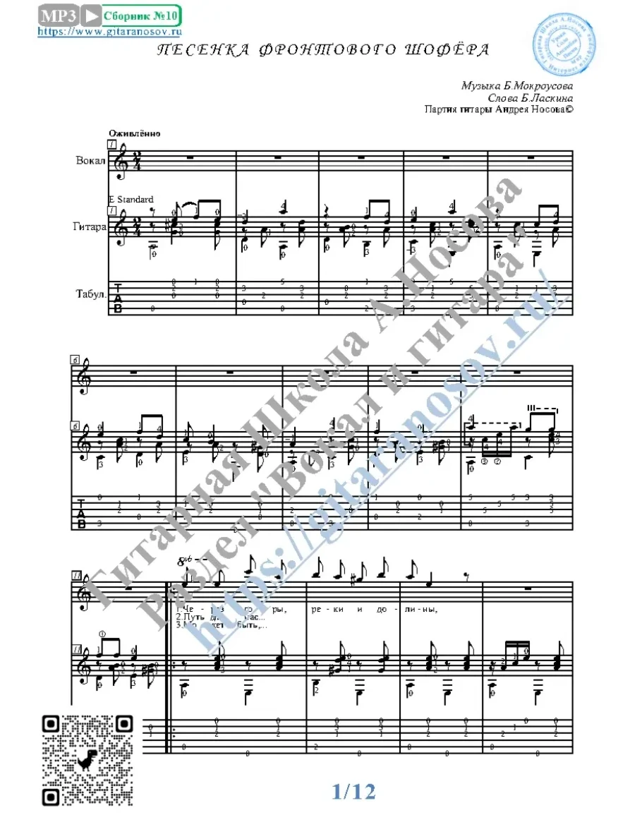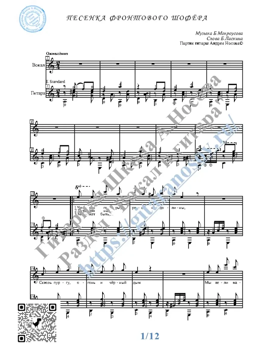 Кликните "Подробнее" для получения дополнительной информацииВашему вниманию предлагается композиция "Песенка фронтового шофёра (муз.Б.Мокроусова, сл.Б.Ласкина, Н.Лабковского)", предназначенная для вокала в сопровождении 6-ти струнной гитары. Запись выполнена нотами и включает в себя партию вокала с подтекстовкой, партию гитары с подробнейшей аппликатурой и текст песни (НА РУССКОМ).