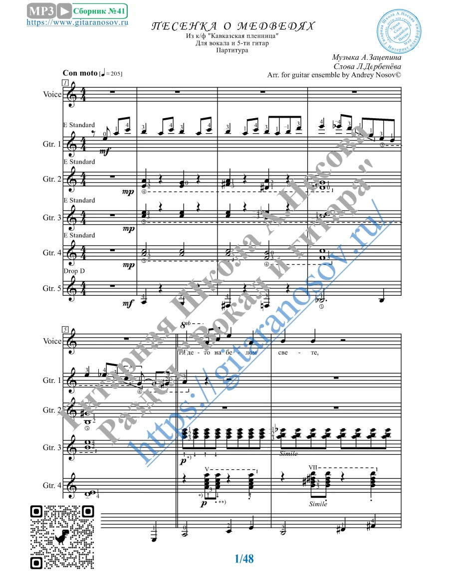 Товар включает в себя партитуру, вокальную партию (НА РУССКОМ) и партии отдельных гитар с подробнейшей аппликатурой (в одном PDF). Прилагается ссылка на прослушивание / скачивание mp3.