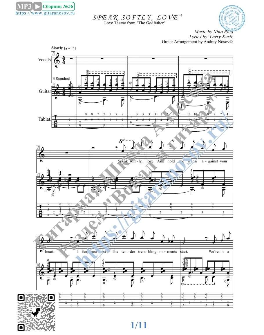 Кликните "Подробнее" для получения дополнительной информацииВашему вниманию предлагается композиция "Speak Softly Love (mus.N.Rota, lir.L.Kusic)", предназначенная для вокала в сопровождении 6-ти струнной гитары. Запись выполнена нотами и включает в себя партию вокала с подтекстовкой, партию гитары с подробнейшей аппликатурой и текст песни (НА АНГЛИЙСКОМ). Партия гитары продублирована табулатурой.