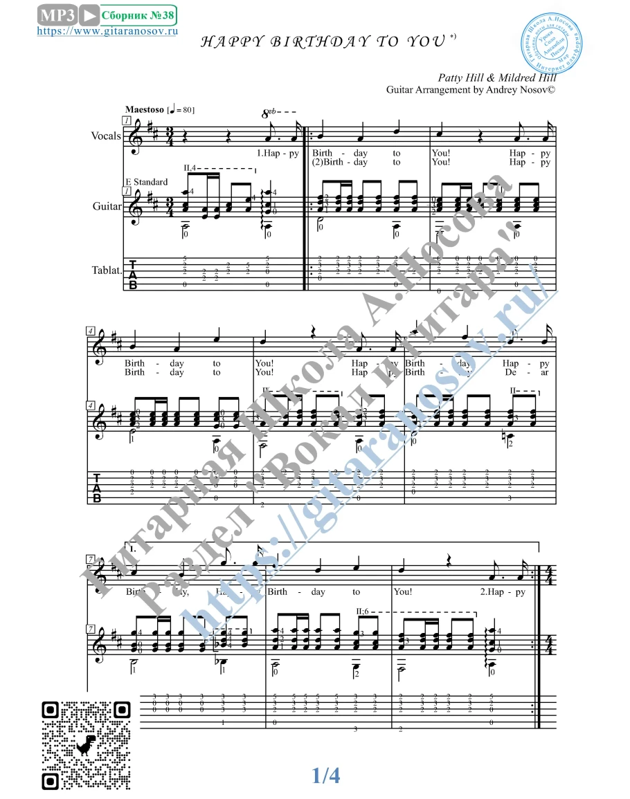 Кликните "Подробнее" для получения дополнительной информацииВашему вниманию предлагается композиция "Happy Birthday to You (P.Hill-M.Hill)", предназначенная для вокала в сопровождении 6-ти струнной гитары. Запись выполнена нотами и включает в себя партию вокала с подтекстовкой, партию гитары с подробнейшей аппликатурой и текст песни (НА АНГЛИЙСКОМ). Партия гитары продублирована табулатурой.