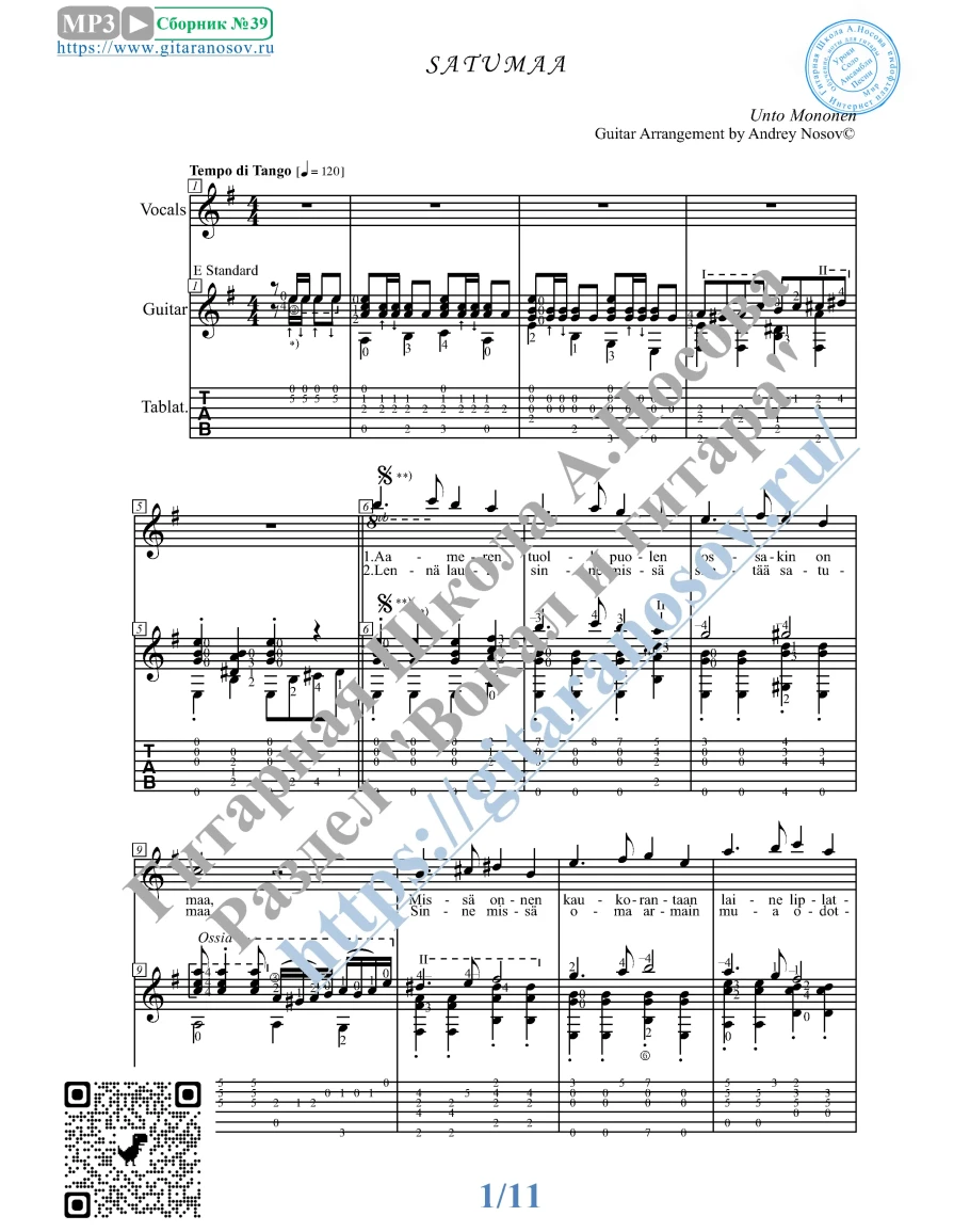 Кликните "Подробнее" для получения дополнительной информацииВашему вниманию предлагается композиция "Satumaa (U.Mononen)", предназначенная для вокала в сопровождении 6-ти струнной гитары. Запись выполнена нотами и включает в себя партию вокала с подтекстовкой, партию гитары с подробнейшей аппликатурой и текст песни (НА ФИНСКОМ). Партия гитары продублирована табулатурой.