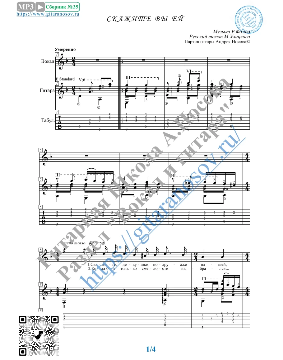 Кликните "Подробнее" для получения дополнительной информацииВашему вниманию предлагается композиция "Скажите вы ей (муз.Р.Фальо, русс.текст М.Улицкого)", предназначенная для голоса в сопровождении 6-ти струнной гитары (pdf / png*). Запись выполнена нотами и включает в себя партию вокала с подтекстовкой, партию гитары с подробнейшей аппликатурой, текст песни (НА РУССКОМ ЯЗЫКЕ). Партия гитары продублирована табулатурой. Прилагается ссылка на скачивание mp3.