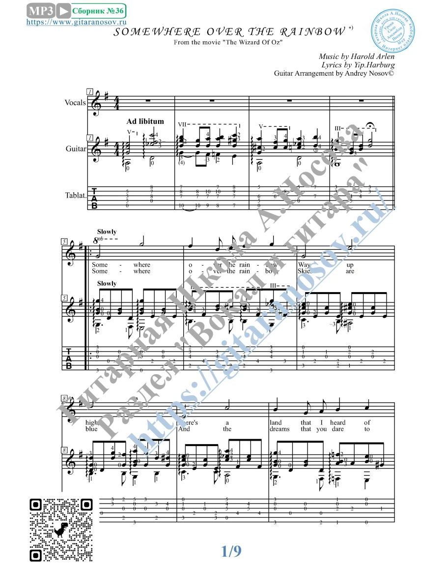 Кликните "Подробнее" для получения дополнительной информацииВашему вниманию предлагается композиция "Somewhere over the Rainbow (mus.H.Arlen, lyr.E.Y.Harburg)", предназначенная для вокала в сопровождении 6-ти струнной гитары. Запись выполнена нотами и включает в себя партию вокала с подтекстовкой, партию гитары с подробнейшей аппликатурой и текст песни (НА АНГЛИЙСКОМ). Партия гитары продублирована табулатурой.