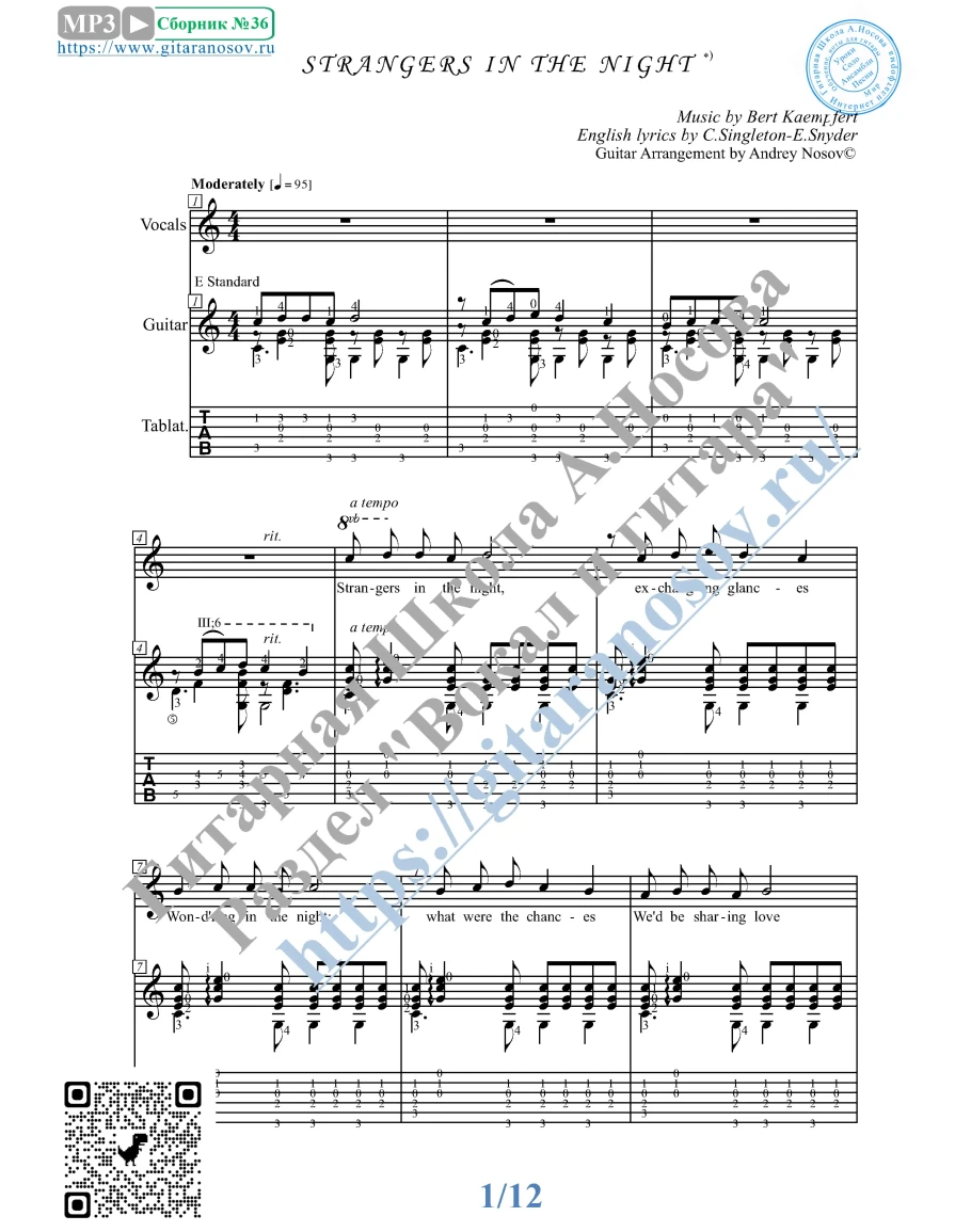 Кликните "Подробнее" для получения дополнительной информацииВашему вниманию предлагается композиция "Strangers in the Night (mus.B.Kaempfert, eng.lyr.C.Singleton-E.Snyder)", предназначенная для вокала в сопровождении 6-ти струнной гитары. Запись выполнена нотами и включает в себя партию вокала с подтекстовкой, партию гитары с подробнейшей аппликатурой и текст песни (НА АНГЛИЙСКОМ). Партия гитары продублирована табулатурой.