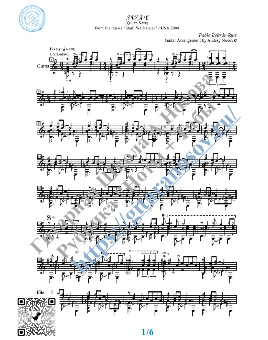 Кликните "Подробнее" для получения дополнительной информацииВашему вниманию предлагается песня "Sway (P.B.Ruiz)" из фильма "Давайте потанцуем?" (США 2004г), предназначенная для исполнения на 6-ти струнной гитаре СОЛО. Запись выполнена нотами, сопровождена подробнейшей аппликатурой и продублирована табулатурой. И ещё…