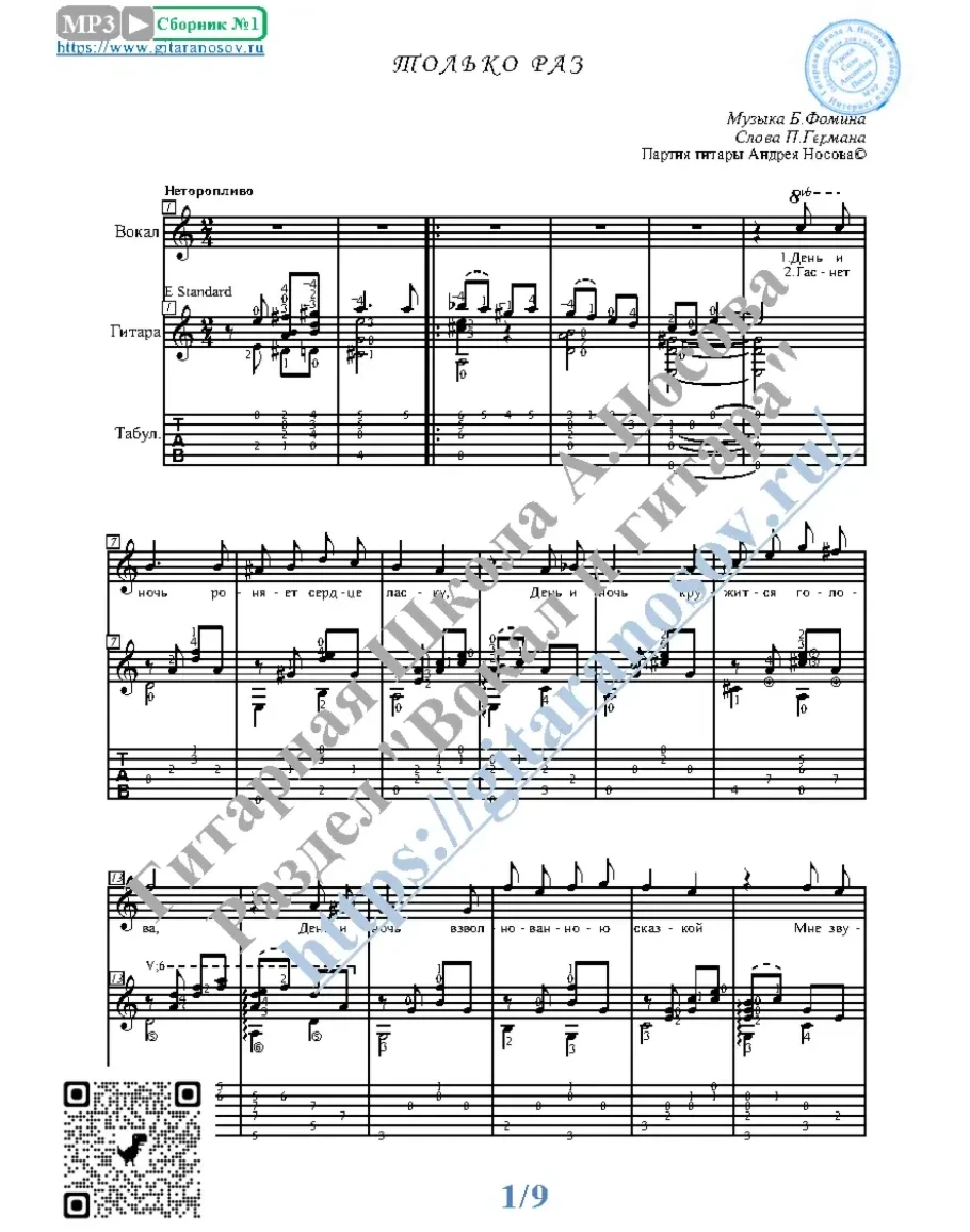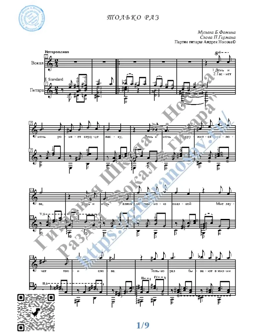 Кликните "Подробнее" для получения дополнительной информацииВашему вниманию предлагается композиция "Только раз (муз.Б.Фомина, сл.П.Германа)", предназначенная для вокала в сопровождении 6-ти струнной гитары. Запись выполнена нотами и включает в себя партию вокала с подтекстовкой, партию гитары с подробнейшей аппликатурой и текст песни (НА РУССКОМ).