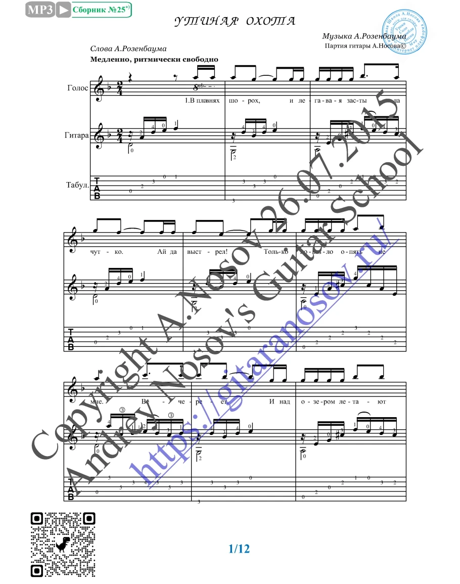 Кликните "Подробнее" для получения дополнительной информацииВашему вниманию предлагается композиция "Утиная охота (А.Розенбаум)", предназначенная для вокала в сопровождении 6-ти струнной гитары (pdf / png*). Запись выполнена нотами и включает в себя партию вокала с подтекстовкой, партию гитары с подробнейшей аппликатурой, текст песни (НА РУССКОМ ЯЗЫКЕ). Партия гитары продублирована табулатурой. Прилагается ссылка на скачивание mp3.