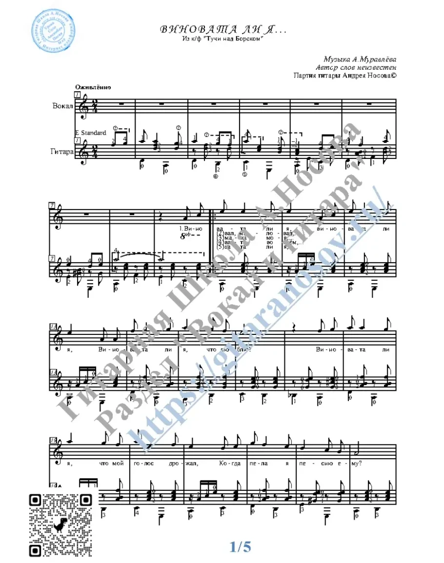 Кликните "Подробнее" для получения дополнительной информацииВашему вниманию предлагается композиция "Виновата ли я (муз.А.Муравлёва, авт.сл.неизвестен)", предназначенная для вокала в сопровождении 6-ти струнной гитары. Запись выполнена нотами и включает в себя партию вокала с подтекстовкой, партию гитары с подробнейшей аппликатурой и текст песни (НА РУССКОМ).