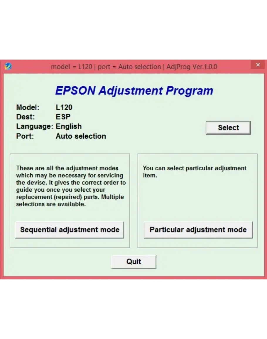 Adjustment program Epson L120 - это сервисная программа для указанных моделей принтеров, программа позволяет сбросить счетчик памперса (отработка, абсорбер), прописывать ID печатающей головки, делать инициализацию принтера и другие функции.